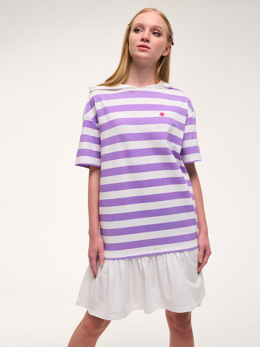 Платье из трикотажа средней плотности в полоску. Капюшон и яркая нашивка спереди. Состав:95% хлопок, 5% эластан