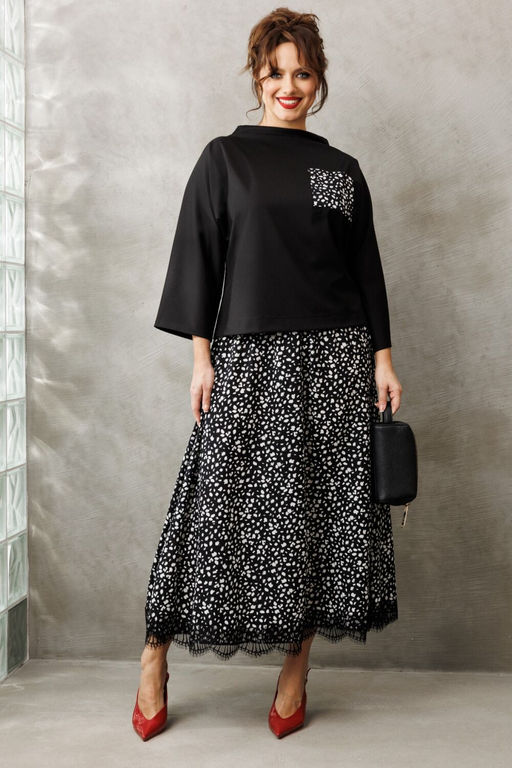 Представляем вашему вниманию стильный  комплект, который станет настоящим маст-хэвом в вашем гардеробе. Этот комплект станет вашим верным спутником в любой ситуации, добавляя нотки элегантности и шарма в вашу повседневную жизнь. Комплект женский 2-х предметный (блузка, юбка). Блузка прямого силуэта,  из трикотажного полотна, со спущенным плечом станет незаменимой вещью в вашем гардеробе. Рукав "летучая мышь", 3/4 длины. Горловина цельнокроенная в виде стойки. В качестве декора - кармашек в цвет юбки.  Юбка расширенная к низу. По низу - кружево. Пояс на резинке. Для повседневного ношения отлично подойдёт будущим мамам и беременным.  Мягкая резинка в поясе не давит и идеально держится на любой талии.  Модель легкой миди в стиле бохо и кэжуал подходит на любую фигуру и отлично вписывается в базовый гардероб для повседневного ношения на работу в офис стиле оверсайз.  Отдельные части крмлекта будут легко сочитаться с вещеми из вашего гардероба. Внимание: рекомендуем использовать антистатик в случае, если юбка электризуется.  Длина блузки(по спинке): (50-60)-61 см. Длина рукава от головины: (50-60) -56см. Длина юбки - 85см.­