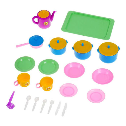 К столу! С яркой посудой от торговой марки «Пластмастер» девочка без труда приготовит обед и накормит куколок сытными и полезными блюдами. Для создания кулинарных шедевров в набор входят 3 кастрюли разных размеров и сотейник. Когда еда будет готова, девочка заварит чай и угостит друзей этим бодрящим напитком. Размеры предметов: кастрюля большая (8 × 12 × 8,5 см);кастрюля средняя (10,5 × 7,5 × 8 см); кастрюля маленькая (7,5 × 9 × 7,5 см); сотейник (14 × 7,5 × 4 см); чайник (7 × 13 × 10 см); миска (10 × 10 × 2 см); тарелка (10 × 10 × 1 см); блюдце (8 × 8 × 1 см); кружка (6 × 7,5 × 5 см); половник (3,5 × 3,5 × 9 см); нож (7 × 1,5 см); вилка (7 × 1,5 см); ложка (7,5 × 2 × 1 см); поднос (25,5 × 16,5 × 1 см). Предметы выполнены из качественного пластика, с использованием безопасных красителей. Для детей старше 3 лет. Вид: Набор посуды.