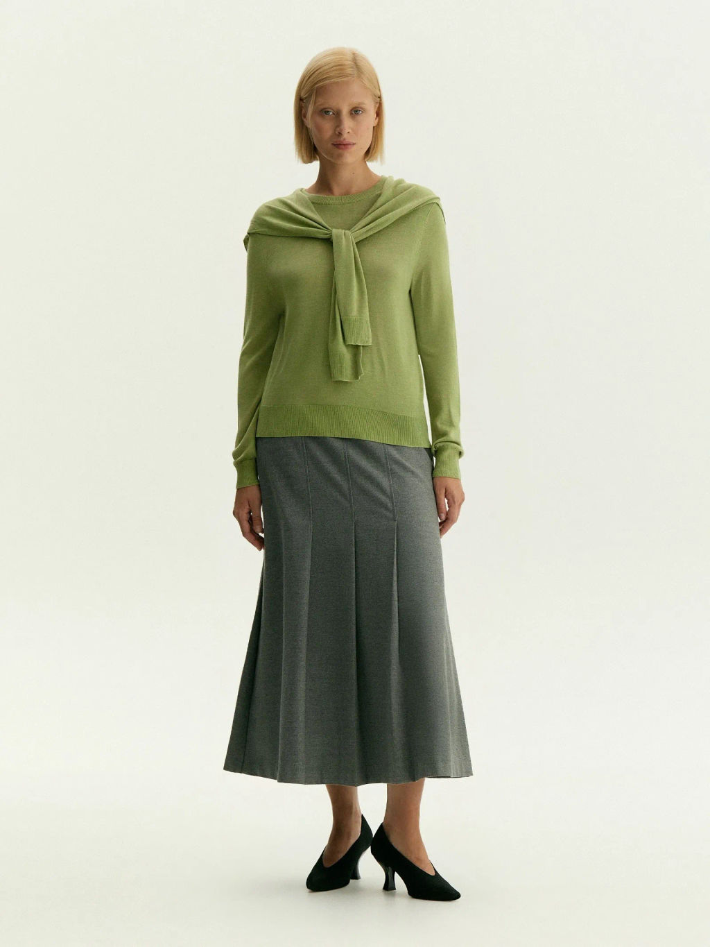 Тёплая зимняя юбка для повседневных образов. Модель французской длины с встречными складками визуально вытягивает силуэт. Интересно смотрится с кардиганами и жилетами, дополнит джемпер или свитер, а также классические офисные рубашки.