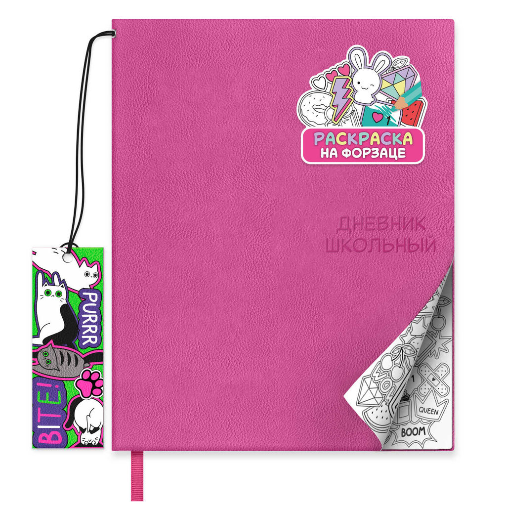 Дневник школьный арт. 68806 / 15 СТИКЕРЫ (кожзам: А5+; мягкий переплёт, запаянный край, материал обложки: искусственная кожа "Наппа экстра"; декор: блинтовое тиснение; способ крепления блока: ниткошвейный; вн. блок: 48 л., белый офсет 80 г/м?, печать в одну краску, справочный материал: универсальная шпаргалка; отделка среза: окрашивание пантоном; закладка: одно ляссе; форзац: печать в одну краску; особенности: закладка из искусственной кожи с полноцветной печатью, раскраска на форзаце; индивидуальная упаковка: промостикер + ПЭТ-пакет)