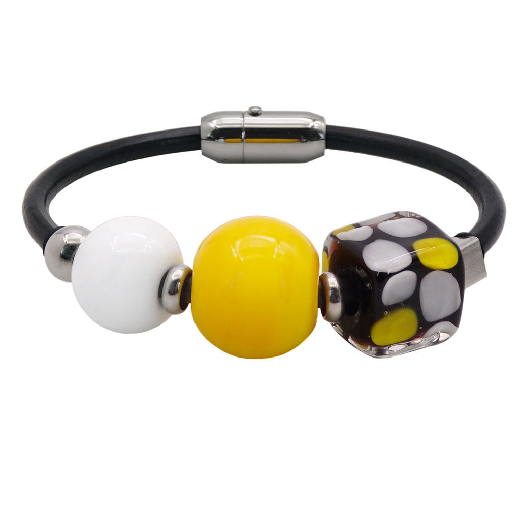Браслет изготовлен из муранского стекла, натуральной кожи и гипоаллергенной ювелирной стали, что очень важно для людей с чувствительной кожей. Металл не темнеет и не подвергается воздействиям окружающей среды, надолго обеспечивая красивый внешний вид изделия. Крепкий магнитный замок надежно фиксируется на запястье. Ширина браслета - 0,5 см. Диаметр стеклянных шароов - 1,2 и 1,6 см. Размер куба - 1,2х1,4 см. Вес - 26 гр.