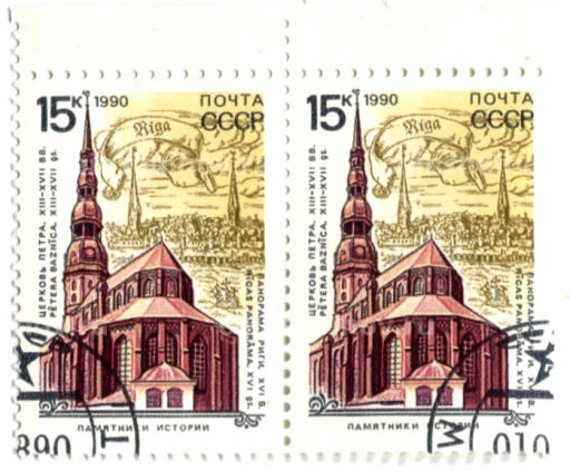 • Марка Памятники истории  Церковь Петра XIII-XV вв 1950 год (блок из 2 марок)