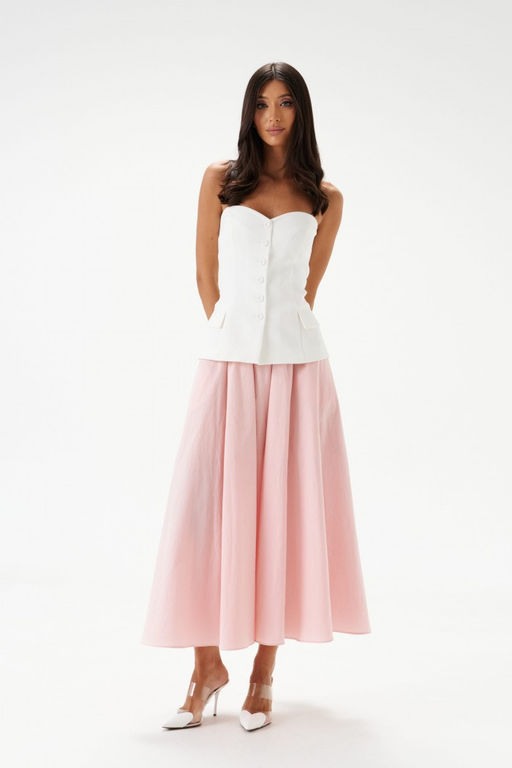 Жилет с открытыми плечами выполнен из костюмного полотна белого цвета.