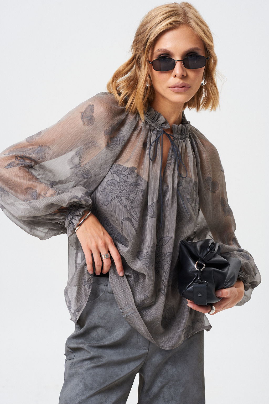 Блуза из летящей легкой ткани. Ткань с Crush-эффектом и с дизайнерским принтом с использованием печати "Флок". Длина блузы 62 см Длина рукава от воротника 73 см.