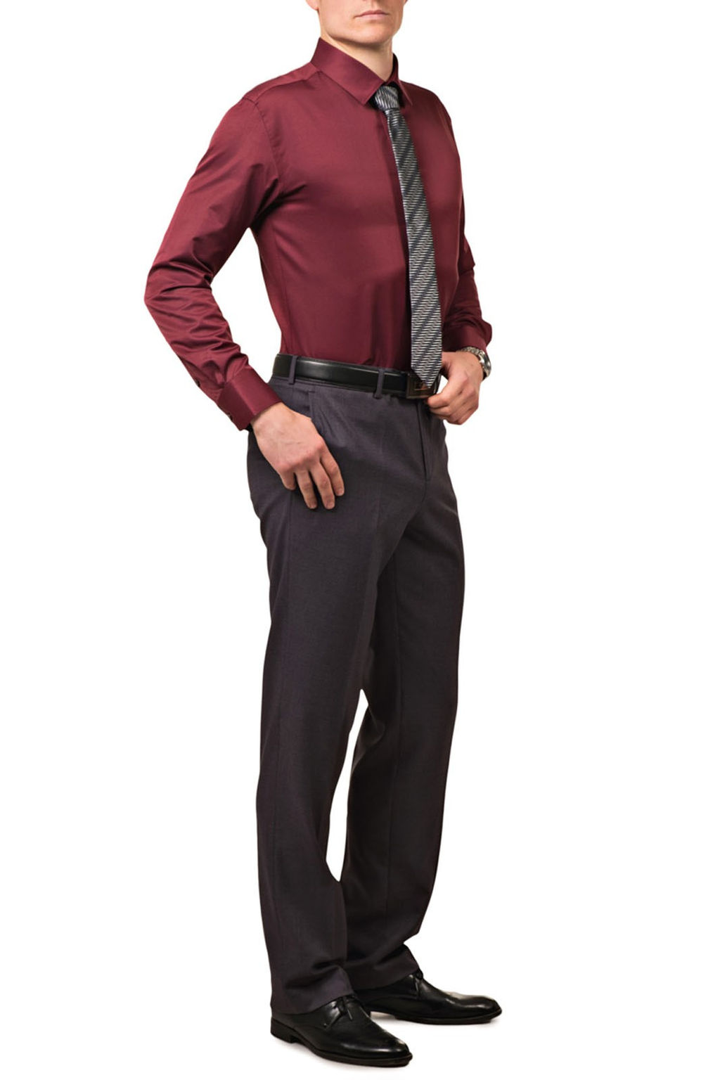 Рубашка классическая, бордового цвета. Длинный рукав, классический воротник. Носить можно под заправку, как с джинсами, так и с брюками в контраст к тону основной ткани.