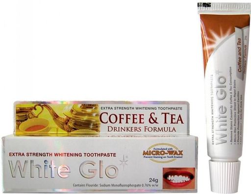 Отбеливающая паста White Glo разработана для любителей кофе и чая. Входящие в состав специальные вещества борются с потемнением эмали и защищают её от возникновения новых пятен. Средство содержит огромное количество витаминов А, С и Е, масло семян шиповника, которые повышают защитные свойства слизистой оболочки полости рта. Стоматологи рекомендуют чистить зубы минимум два раза в день.