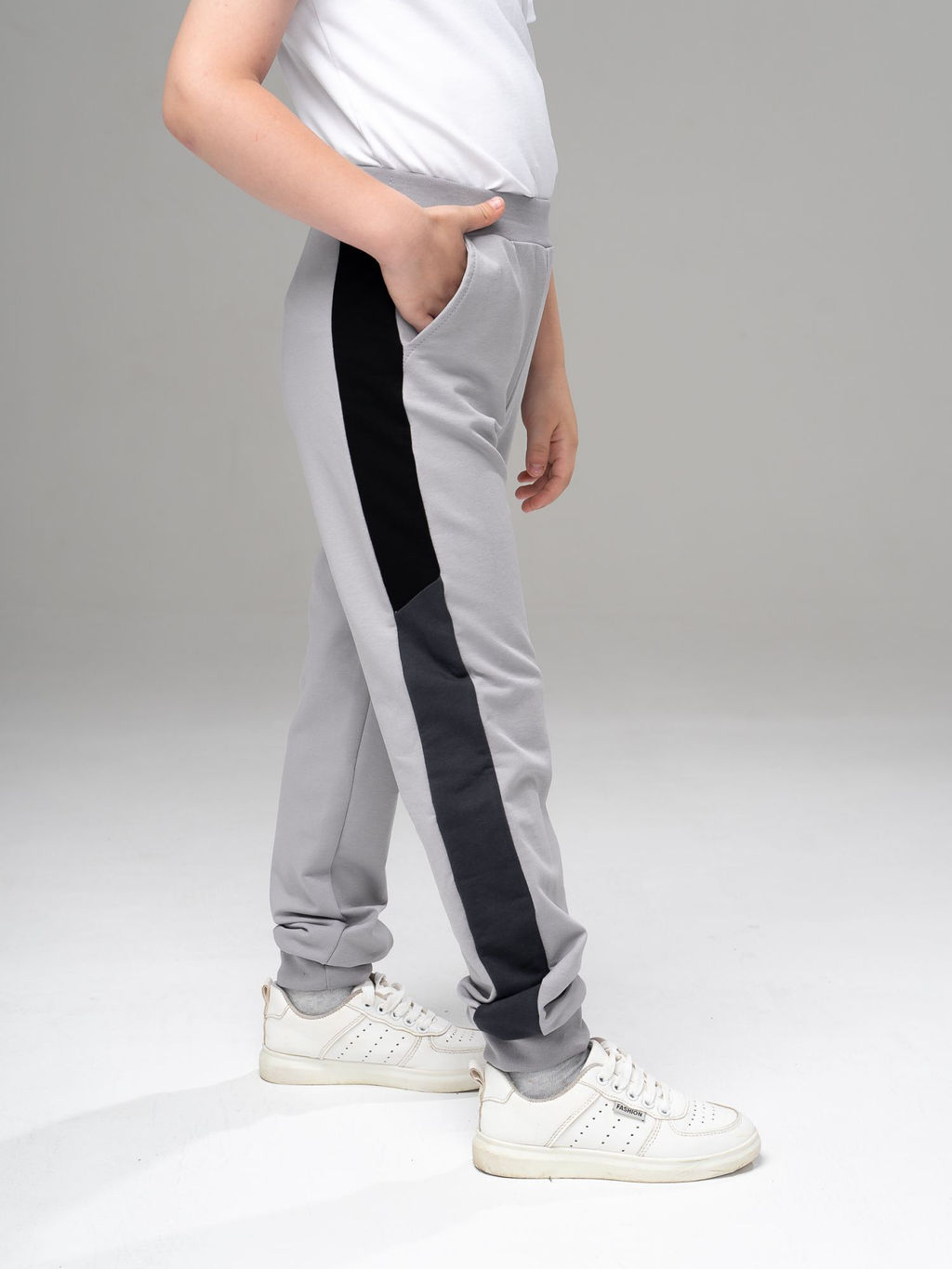Спортивные брюки из футера серого цвета , слегка зауженного силуэта с боковыми карманами и широкими лампасами из отделочного полотна двух цветов. Пояс на эластичной резинке. Низ брюк на манжетах. Изделие выполнено из трикотажа премиального качества - ПЕНЬЕ, с содержанием хлопка более 92%