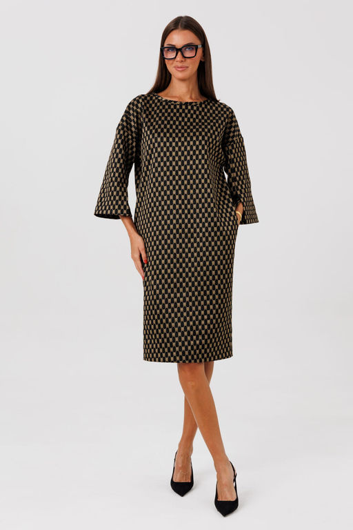 Платье прямого силуэта со спущенной линией плеча. Спинка изделия имеет средний шов с открытой шлицей, высотой 22 см. В боковых швах изделия: карманы. Рукав притачной со спущенной проймой и укороченной длины. Спереди рукава заложена открытая шлица. Горловина платья имеет форму округлой лодочки, которая обработана устойчивой бейкой, шириной 1 см.