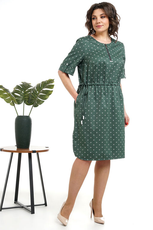 Платье женское прямого силуэта, отрезное по линии талии с кулисой и завязкой фиксируемая степень прилегания, в боковых швах карманы, низ фигурной формы.