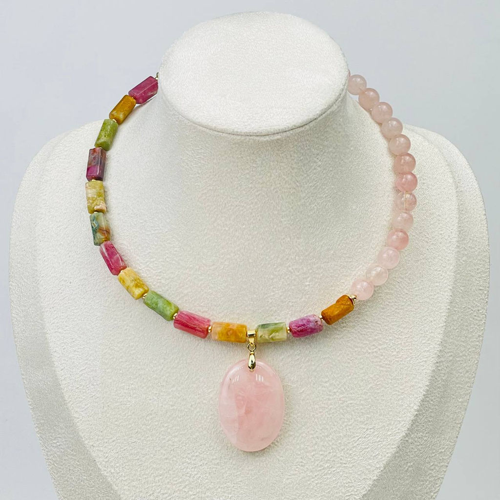 Колье из Турмалина микс и Розового кварца 38 см +