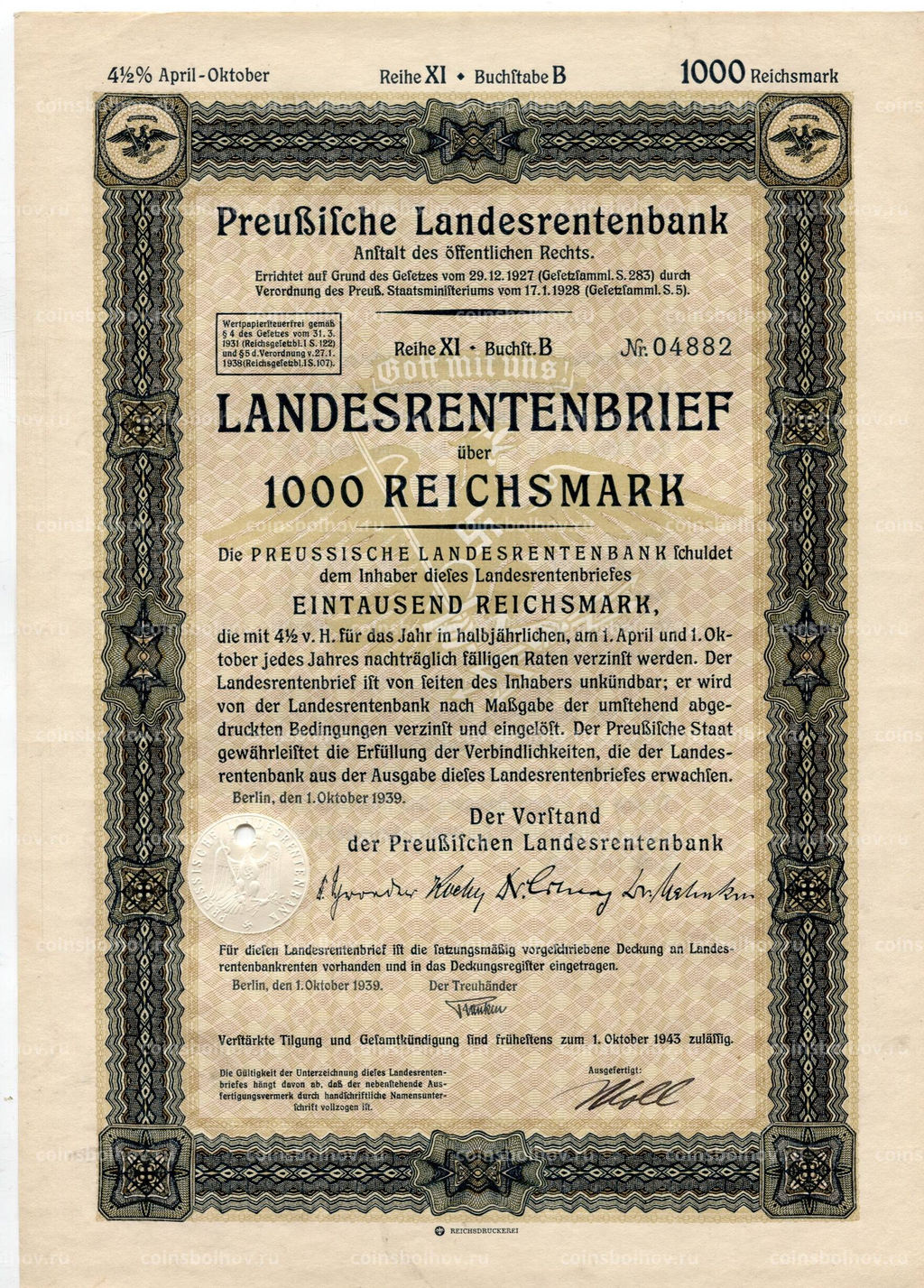 • Облигация 4,5% 1000 рейхсмарок 1939 года Германия