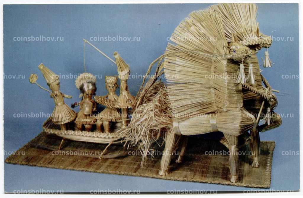 • Открытка Е.Г. Артеменко Масленица (Тройка). Солома, хлопчатобумажная цветная и шерстяная нити