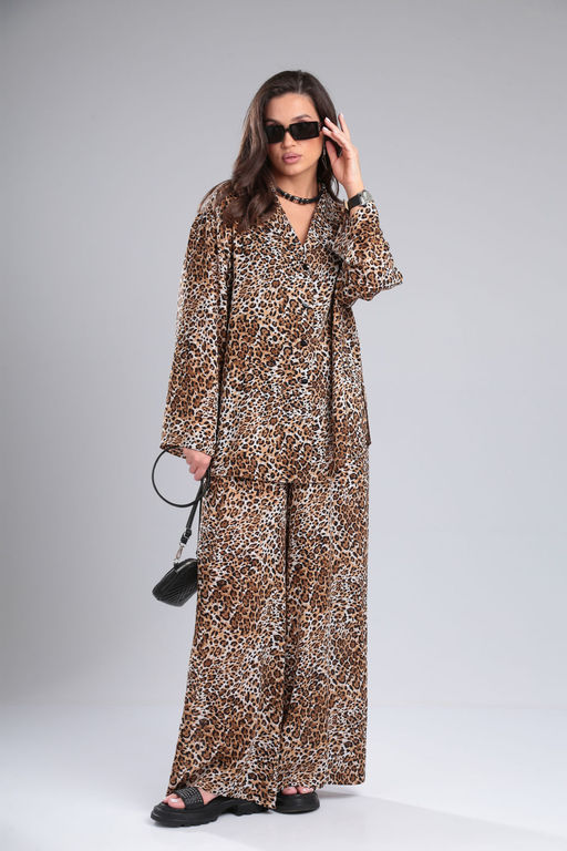 Летний костюм оверсайз из летней ткани в пижамном стиле. Блузон с отложным воротником и  лацканом. Рукав втачной на спущенной пройме. В боковых швах блузона разрезы. Застежка петли-пуговицы. Брюки палаццо с высокой посадкой на эластичной резинке по талии и карманами в боковых швах.