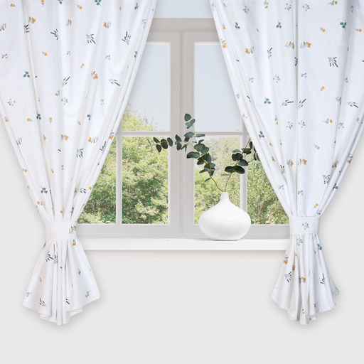 Набор из двух кухонных штор с подхватами создаёт уютную и свежую атмосферу. Белое полотно с нежным цветочным рисунком мягко рассеивает солнечный свет, наполняя комнату спокойным, ровным освещением. Комплект подойдёт для оформления окна на кухне или в столовой.