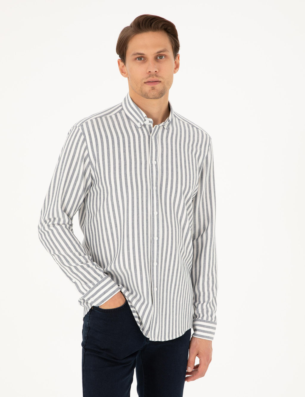 Мужская рубашка Regular Fit темно-синего цвета с полосатым рисунком и длинными рукавами. Классическая модель с комфортной посадкой идеально подходит для повседневной и деловой носки. Универсальный дизайн позволяет сочетать рубашку с брюками и джинсами.