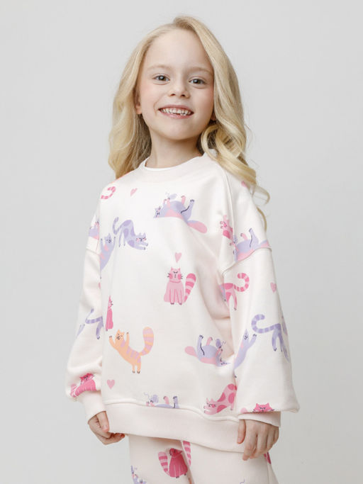 Свитшот для девочки с эластичным поясом из высококачественного трикотажного полотна. В составе 80% натурального хлопка и 20% полиэстера, при этом полиэстер ввязан внутрь по особой технологии и не соприкасается с кожей. На рукавах мягкие манжеты. Оригинальный рисунок выполнен из стойких текстильных гипоаллергенных красителей. Изделие сохраняет цвет и форму после многократных стирок. Все трикотажные полотна производятся в соответствии с нормами швейцарского сертификата ЭкоТекс.­