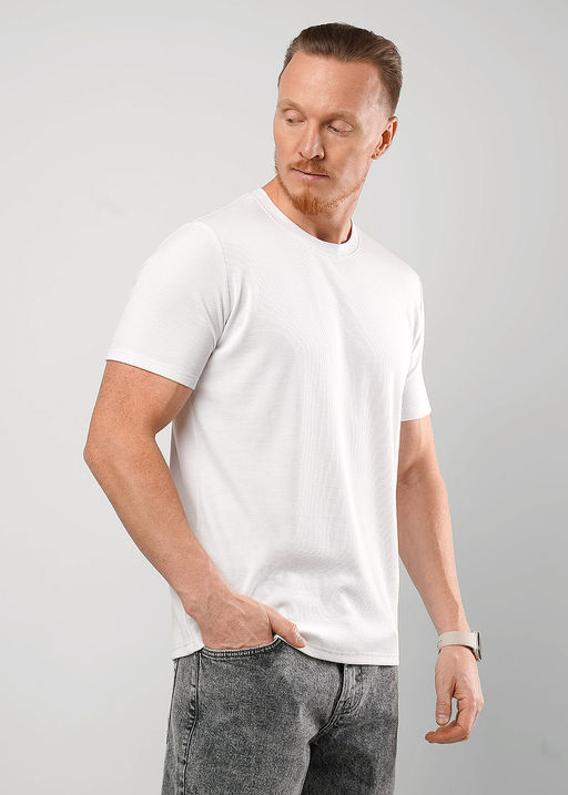 Модная мужская футболка из трикотажного фактурного полотна, с вшивкой сбоку. Подойдет на каждый день в сочетании с джинсами или брюками кэжуал. 68%ПЭ27%Вис 5%ПУ(эластан)