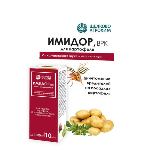 Препарат от колорадского жука и его личинок на картофеле. Характеристики: * тип: средство защиты от насекомых; * назначение: от колорадского жука и его личинок; * форма выпуска: жидкость; * объем: 10мл; * состав: 200г/л имидаклоприда; * упаковка: флакон; * срок годности: см. на упаковке. Действие: * уничтожает колорадского жука и его личинки разных возрастов за 24 часа; * обеспечивает результат на длительное время, не вызывает привыкание у насекомых; * прекрасно работает в жару, устойчив к смыванию водой. Применение: * рабочий раствор готовят непосредственно перед применением; * норма применения препарата - 1мл/5л воды /100кв.м; * опрыскивание в период вегетации; * сроки выхода для проведения ручных работ 3 дня; * объем приготовленного рабочего раствора с целью исключения его возможных остатков должен соответствовать предполагаемому объему работ; * ручной или ранцевый опрыскиватель на 1/3 заполнить водой, залить полную дозу препарата, долить оставшееся количество воды и все тщательно перемешать.