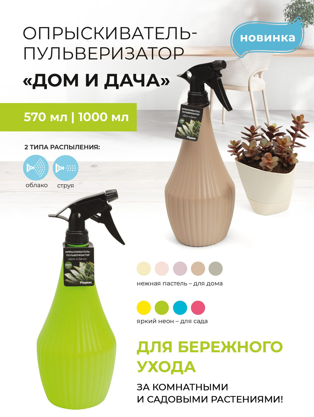 Ручной опрыскиватель-пульверизатор объемом 1000 мл. Работает в двух режимах распыления (водяная пыль) и струя.Незаменимый помощник в отопительный период и при засухе. Применяется в домашнем хозяйстве для ухода за комнатными растениями, распыления жидких растворов удобрений для растений и очистки поверхностей. Имеет ручку пистолетного типа для удобного захвата. Материал: полипропилен. Прочный и крепкий пластик - удобно держать в руке­