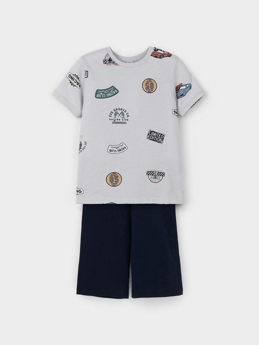Пижама для мальчика из натурального хлопка. Футболка с короткими втачными рукавами и шорты с эластичной резинкой в поясе. Оригинальная набивка выполнена из стойких текстильных гипоаллергенных красителей. Изделие сохраняет цвет и форму после многократных стирок. Все трикотажные полотна производятся в соответствии с нормами швейцарского сертификата ЭкоТекс.. Состав: 100% хлопок