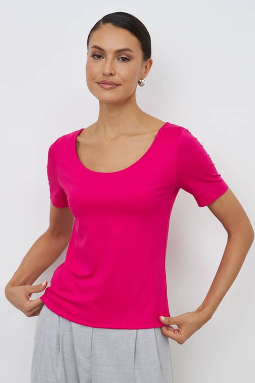 Двухслойный джемпер полуприлегающего силуэта из вискозного эластичного полотна. Втачной короткий рукав, круглый вырез горловины. Благодаря двухслойности переда и спинки изделие скрывает мелкие недочёты фигуры и делает силуэт более ровным. Актуальный джемпер придаст совершено особое звучание и строгим классическим брюкам, и нарядной юбке и даже спортивному костюму. Его легко применять для создания разных образов.