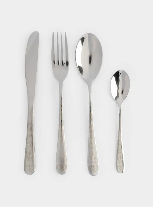 Столовые приборы, 6 персон, 24 предмета. Материал: нержавеющая сталь 18/0. Комплектация: нож столовый - 6 шт, вилка столовая - 6 шт, ложка столовая - 6 шт, ложка чайная - 6 шт. Рекомендуется мыть вручную с применением мягких моющих средств во избежание появления царапин на поверхности приборов. Не использовать для ухода абразивные чистящие средства и жесткие губки. Можно мыть в посудомоечной машине.