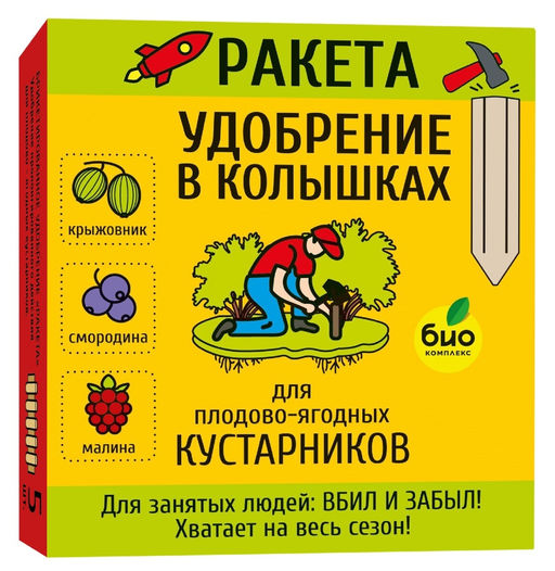 Инновационная разработка! Твердые брикеты комплексно-минерального удобрения в виде колышков. Применяется в качестве основной подкормки для плодово-ягодных кустарников весной либо осенью. Характеристики: * тип: удобрение комплексное минеральное; * форма выпуска: сухое брикетированное; * состав: комплекс NPK, медь, цинк, марганец, бор, кобальт; * назначение: плодово-ягодные кустарники: крыжовник, смородина, малина и т.д.; * масса: 420г; * комплект в упаковке: 5шт; * упаковка: картонная коробка, пакет; * гарантийный складской срок хранения: см. на упаковке. Применение: * вбить необходимое количество удобрительных колышков в увлажненную землю на всю площадь приствольного круга, ориентируясь на площадь кроны, используя деревянный молоток; * на бедных почвах дозы удобрений следует увеличить на 25-30%; * при подкормках в течение периода активного роста дозы снизить на 50%. Способы и нормы внесения: * смородина (черная , белая, красная) - для компактных кустов вносится 1-2 колышка; * крыжовник - для габаритных кустов вносится 2-3 колышка; * малина - 1 колышек на 1кв.м. посадки. Вносить удобрение рекомендуется начиная со 2го года жизни растения. Особенности: * удобрение длительного действия; * не пересаливает почву; * простое в применении. Растворение удобрения происходит постепенно в течение всего сезона. Не требует подготовки почвы (перекопки, взрыхления). Удобно. Вбил и забыл!