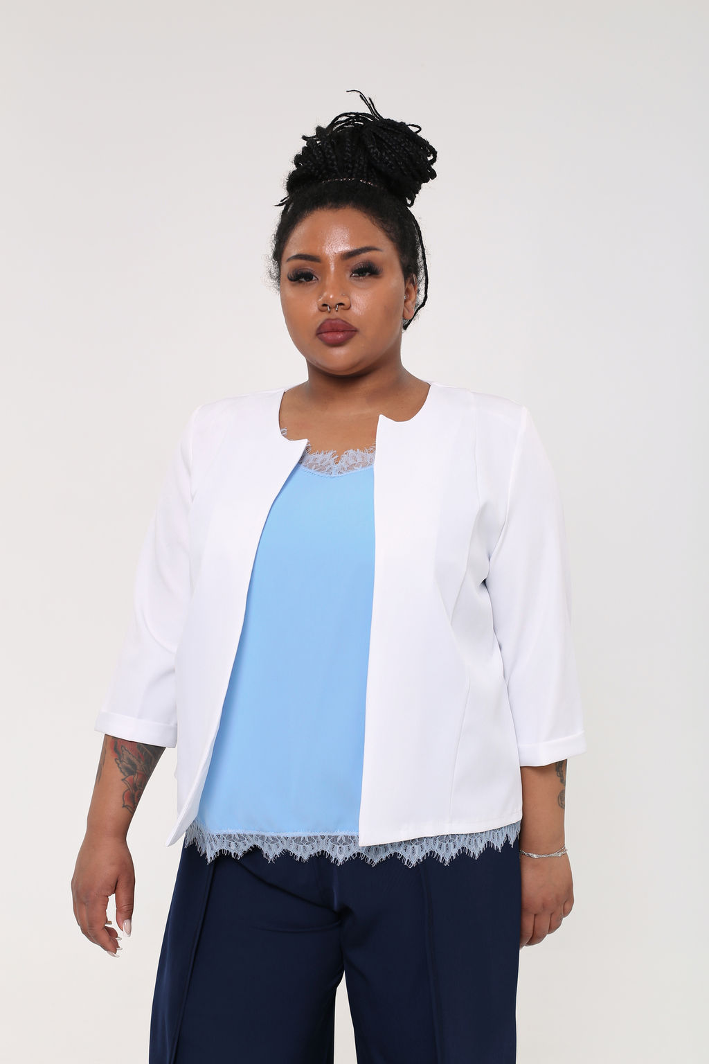 Укороченный  жакет прямого кроя выполнен из мягкого материала. Модель имеет круглый вырез и рукава длиной ?.  Небольшие подплечники зрительно вытягивают силуэт и делают осанку более выправленной. Модель полуприлегающего силуэта без застежки - отлично подходит для завершения стильного образа.