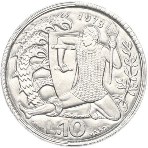• Монета 10 лир 1973 года Сан-Марино