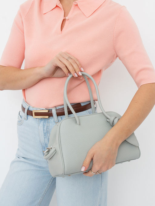 Компактная сумка, выполнена из натуральной кожи. Декорирована эффектной ручкой. Дополнена серебристой фурнитурой. Данная модель закрывается на молнию. Каркас полужесткий. Носится в руке за встроенные ручки или через плечо. В комплекте имеется съемный ремень с регулировкой длины. На дне предусмотрены ножки.