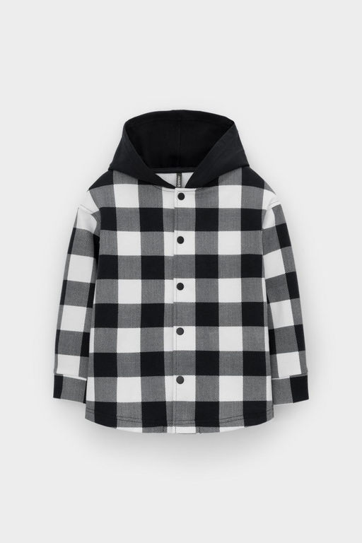 Свободная трикотажная рубашка для мальчика с капюшоном. Выполнена из мягкого петельчатого футера. Застёгивается на кнопки. Модель с закругленным низом и спущенным плечом. По бокам разрезы.. Состав: 100% хлопок