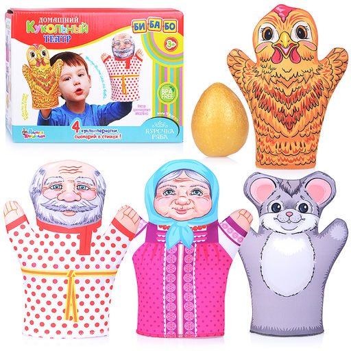 - количество кукол: 4 (дед, бабка, курочка Ряба и мышка) размером - 25 х 18 см;