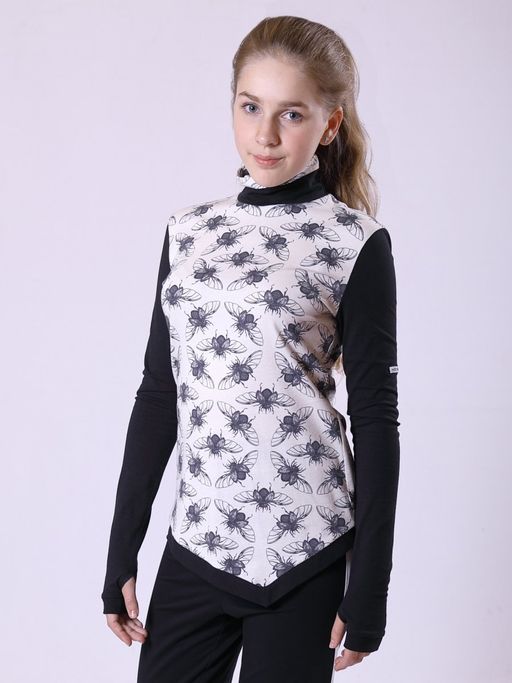Водолазка для девочки средней длины, прилегающего силуэта, с длинными втачными рукавами, воротником -стойкой, поясом. Рукава с манжетами и отверстием для большого пальца. Низ изделия фигурный. Рукава, пояс и верхний воротник выполнены из полотна контрастного цвета. В качестве дополнительного декора использованы брендовые этикетки и флажки Состав:92% хлопок, 8% лайкра