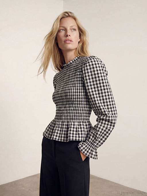 • Dik Yaka Ekose Balon Kollu Gipeli Bluz