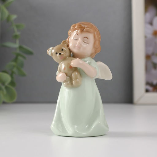 • Сувенир керамика "Малышка-ангел в зелёном платье с медвежонком" 5х4х9 см