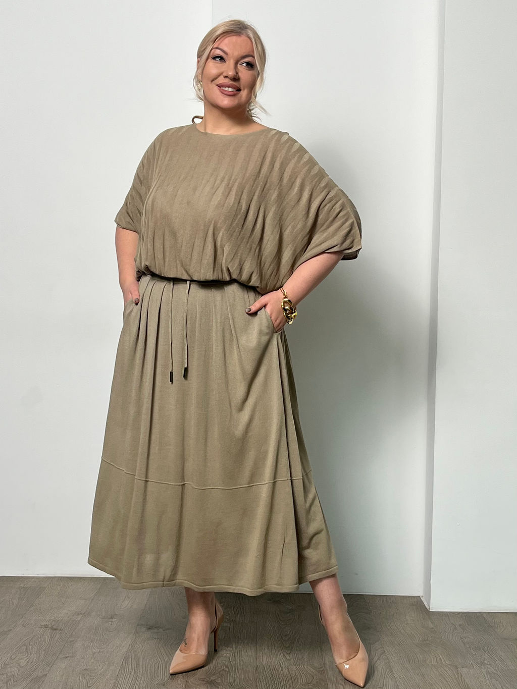 Юбка свободная на резинке с люрексом бежевая­