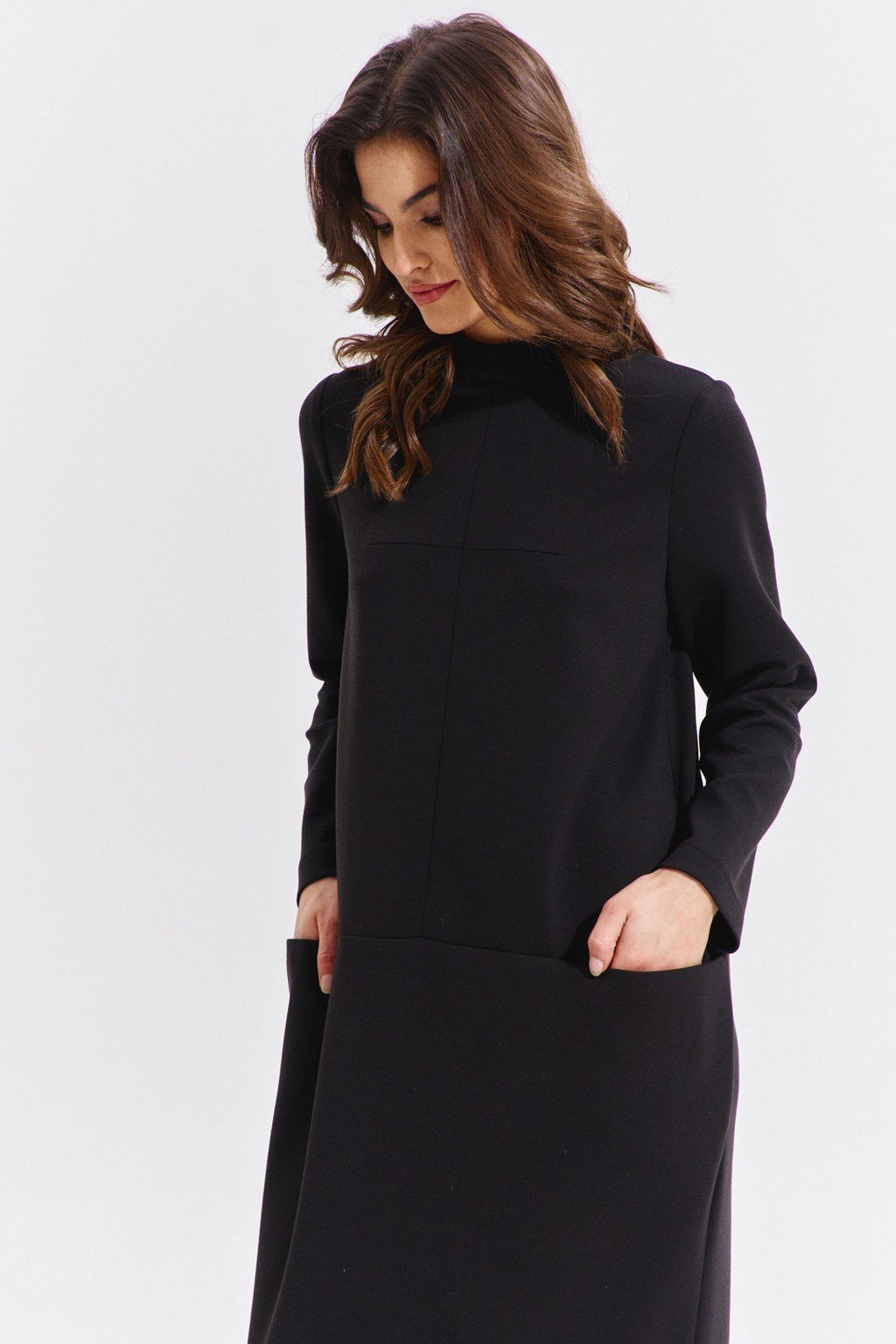 Платье свободного кроя, длиной до щиколотки. По спинке подрез чуть выше линии бедер. Нижняя часть спинки со средним швом, в котором обработана шлица. Перед с подрезом выше линии бедер. Верхняя часть переда со средним швом, с нагрудными вытачками от него. В подрезе обработаны карманы. Рукава длинные, одношовные, втачные. По горловине стойка. По спинке застежка на декоративную тесьму-«молнию». Состав 77% вискоза, 15% ПА, 8% спандек .Ткань: трикотаж