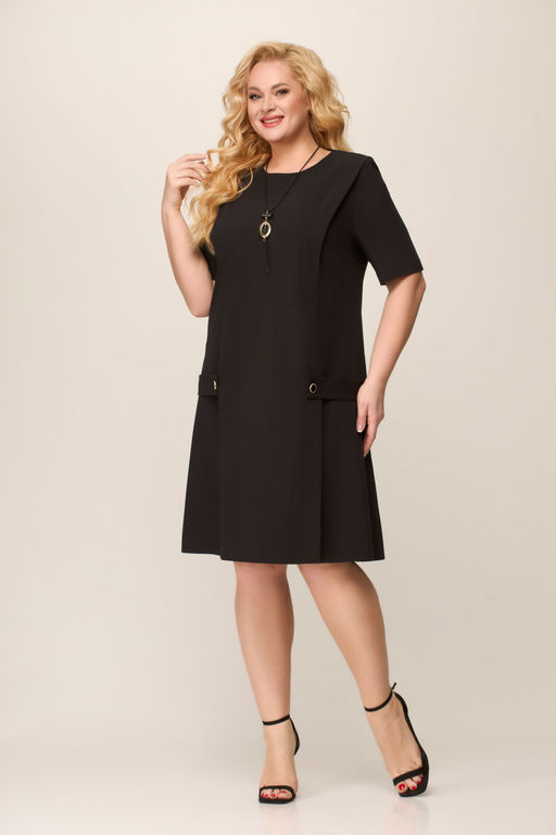 Платье женское А-силуэта с втачным рукавом. По переду и спинке вертикальные складки. По линии груди вытачка. Застежка в среднем шве спинки на петлю и пуговицу. В области бедер съемная декоративная деталь.