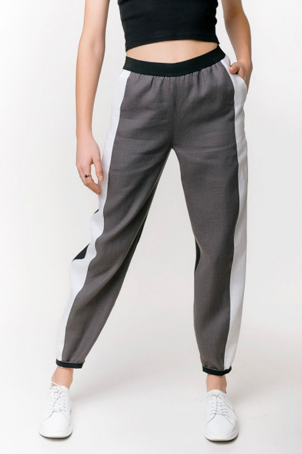 Льняные брюки в спортивном стиле, выполненные в комбинации 3-х цветов. Брюки предлагаются в комплекте с курткой арт. 065 и составляют стильный и удобный летний комплект, отлично подходящий для любой размерной и возрастной группы.