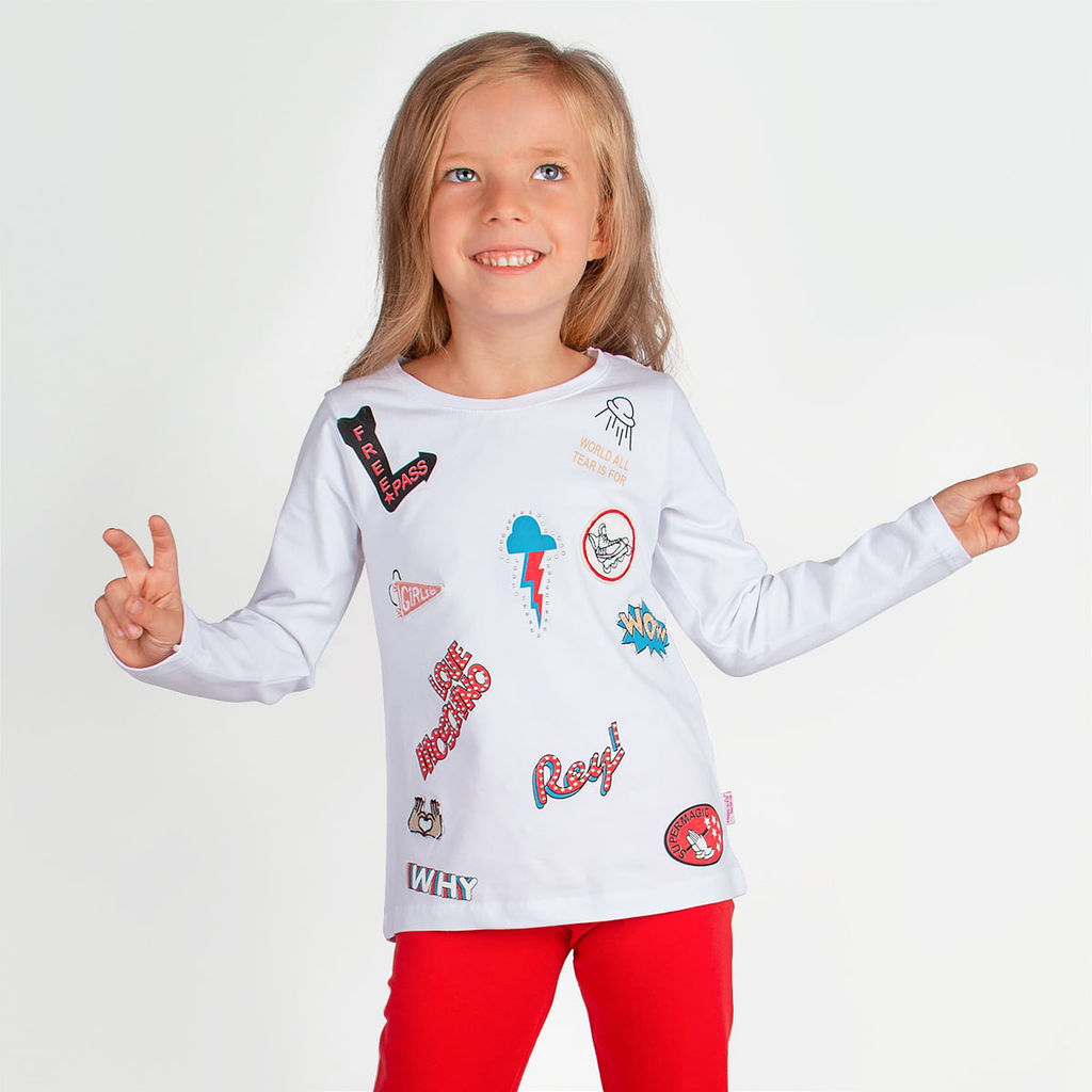 Стильный лонгслив удлинённый сзади для девочки. Модель декорирована оригинальными принтами, нашивками и стразами.
