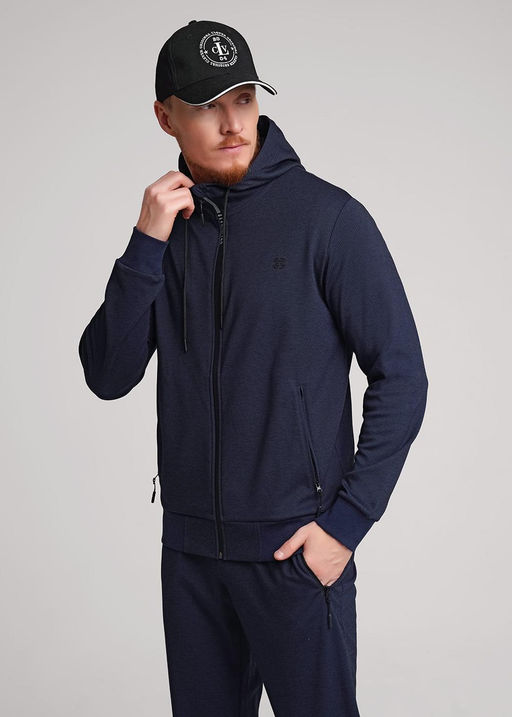 Куртка мужская с застежкой-молнией по переду на капюшоне из плотного пике. Рукава втачные с манжетой, по низу пояс. На капюшоне люверсы со шнуром и наконечниками. Для функциональности и удобства спереди карманы на молнии с тесьмой. Состав: