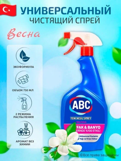Описание товара Согласно результатам независимого тестирования, проведенного на кухне, в ванной комнате, и на различных поверхностях, турецкое универсальное средство ABC с весенним ароматом показало отличные результаты при борьбе с остатками шампуня, остатками извести, остатками мыла на оргстекле, пятнами на плитке, стекле, нержавеющей стали, алюминиевых поверхностях.