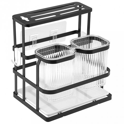 "Антонио" Подставка металлическая, окрашенная для столовых приборов и кухонной утвари универсальная, 20х16см h21,9см, стакан акриловый, съемный, с отверстиями - 2 штуки, крючок пластмассовый, съемный - 4 штуки, поддон пластмассовый, самоклеющийся крю