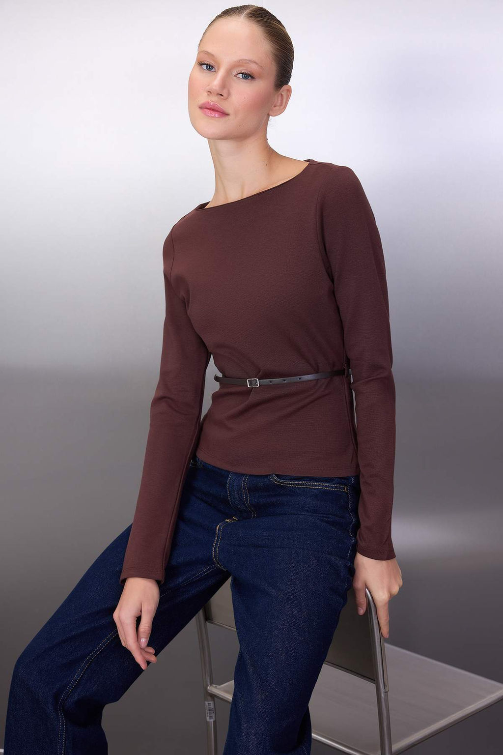 Kahverengi Kemer Detayl? Dik Yaka Uzun Kol Esnek Orme Bluz TWOAW26BZ00084