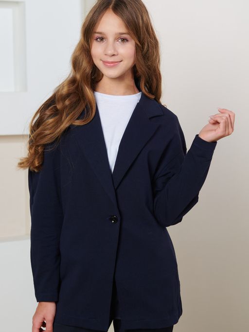 Жакет для девочки из трикотажного полотна, прилегающего силуэта, с длинными рукавами рубашечного покроя, отложным воротником, с лацканами по борту. Застежка на 1 пуговицу. Состав:92% хлопок, 8% лайкра