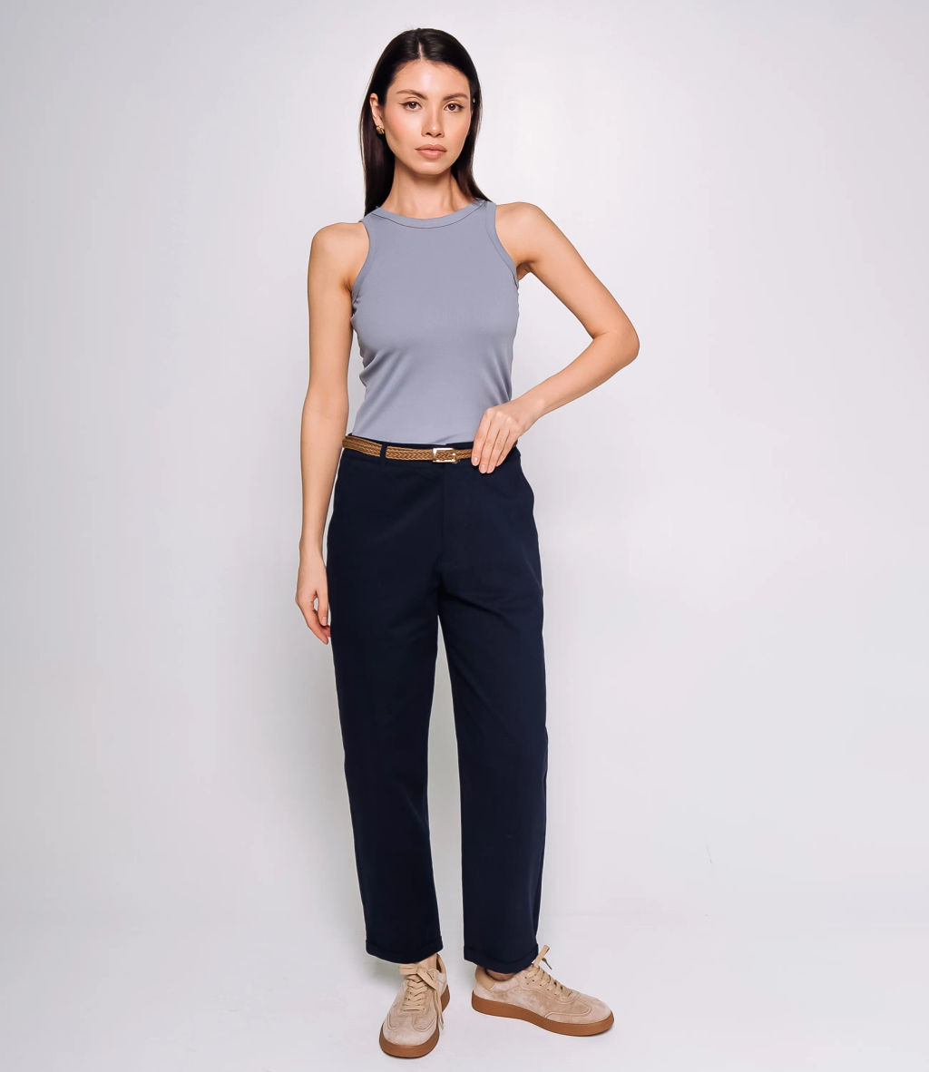 Брюки это важная часть гардероба, которая подчеркивает утонченность и профессионализм каждой женщины. Брюки выполнены из плотного гладкого материала средней плотности с лёгким структурированным блеском, имеют прямой силуэт с высокой талией и классической посадкой, передняя часть оформлена плоской ширинкой с центральным швом и скрытой застёжкой, талия оснащена шлевками для ремня и тонким декоративным ремнём с металлической пряжкой. Для пошива использована ткань: 97% хлопок, 3% эластан. Материал средней плотности хорошо держит форму, обладает приятной на ощупь структурой и обеспечивает комфорт при носке. Даже после многократных стирок изделие не утратит первоначальной аккуратности и цвета, что важно для поддержания высокого уровня продаж в рознице. Обратите внимание на насыщенные оттенки: цвет соответствует фотографии на сайте. Модель имеет два боковых кармана и декоративные швы, подчеркивающие структуру изделия. Для уверенности в размере на странице представлена таблица, с помощью которой можно самостоятельно снять мерки и подобрать нужный размер. Мы предлагаем выгодные оптовые условия, гибкую ценовую политику и стабильные поставки для ваших магазинов. Цена установлена адекватная, что позволит вам формировать привлекательную наценку и обеспечивать высокую оборотность. Подарите своим клиенткам изделие, которое сочетает в себе стиль, комфорт и надежное качество. -- Характеристики -- Цвет: темно-синий Пол: Женский Страна производитель: Китай Сезон: Демисезон Материал: Хлопок, Эластан
