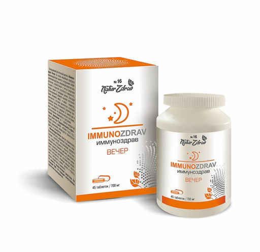 Инновационной растительный комплекс Иммуноздрав Вечер на основе природных иммуномодуляторов является натуральным профилактическим средством, повышающий защитные силы организма, разработанный с учетом биоритмов человека и защитной способности иммунитета, которая зависит от циркадных ритмов. Благодаря сбалансированной формуле комплекс восполняет баланс витаминов, микро и макроэлементов, аминокислот, учитывая циклические колебания (циркадные ритмы) интенсивности различных биологических процессов, связанные со сменой дня и ночи, влияющие на физиологическое состояние, интеллектуальные возможности и настроение. Повышает сопротивляемость организма к инфекциям, рекомендуется для ослабленного организма после операций, болезней и при хронических заболеваниях. Применение растительных концентратов и антиоксидантов способствует повышению активности и замедлению процессов старения, нейтрализует пагубное воздействие свободных радикалов, обладает общеукрепляющим, адаптогенным, иммуностимулирующим действием, нормализует обмен веществ, работу желудочно-кишечного тракта. Комплексный прием Иммуноздрав Вечер способствует устранению нарушения биоритмов, избавляя от проблем со сном и изматывающей бессонницы, что в дальнейшем укрепляет иммунитет и позволяет организму лучше бороться с инфекциями и разными болезнями.