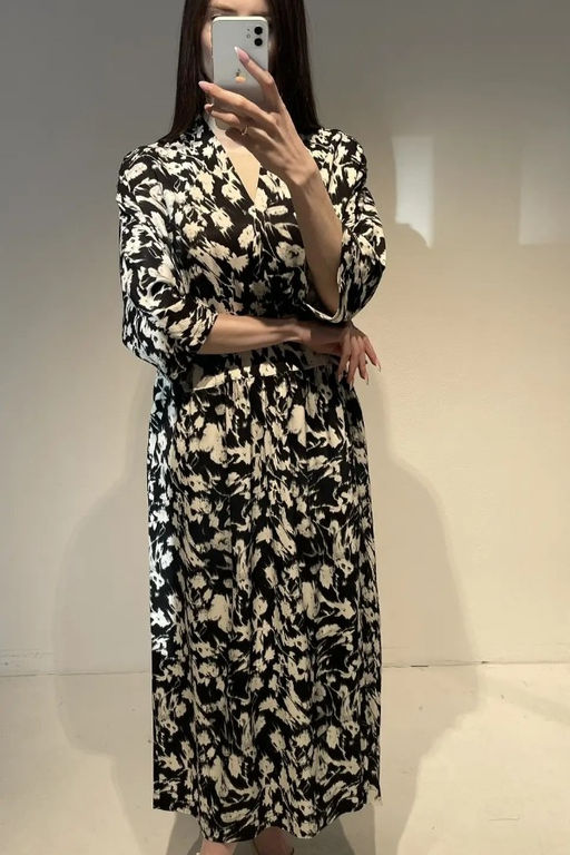 Платье из вискозной ткани очень свободного силуэта. Изделие отрезное чуть ниже линии талии, со сборкой на юбке и подрезными карманами. Цельнокроеная стойка, переходящая в V-образный вырез горловины, визуально делает фигуру стройнее. Длинный цельнокроеный рукав. В таблице размеров представлены параметры человека, а не изделия.