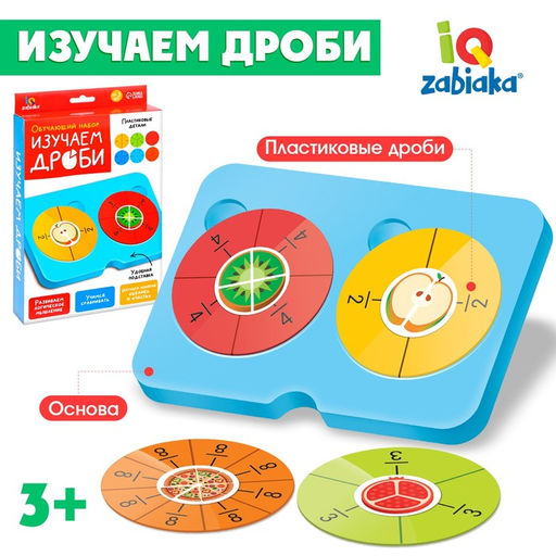 С набором «Изучаем дроби» малыш освоит понятия числа и потренирует логическое мышление, внимание и память. Внутри вы найдёте игровую основу и 6 пластиковых кругов.Как пользоваться наборомДостаньте все детали и разложите по местам. Пусть ребёнок самостоятельно попробует складывать круги в основу из разных деталей. Объясните малышу понятия «часть», «целое» и «доля».Выполняйте задания из памятки для родителей. Например, выложите круг из фрагментов с маркировкой ¼, и попросите малыша посчитать детали этого круга. Получилось 4 — это значит, что круг поделён на 4 части, а каждая его часть составляет ¼ доли от целого.По аналогии познакомьте ребёнка с оставшимися дробями. Собирайте их в круги, смешивайте между собой и сравнивайте друг с другом!Набор рекомендован детям старше 3 лет. Возраст: От 3 лет. В наборе, шт.: 7. Развитие навыков: Внимание. Развитие навыков: Фигуры, цвета. Развитие навыков: Память. Развитие навыков: Логика. Развитие навыков: Счёт. Тема обучения: Цифры, счёт, математика. Тема обучения: Развитие логики/мышления. Тема обучения: Развитие памяти. Бесплатная доставка: Да. Наша разработка: Да.